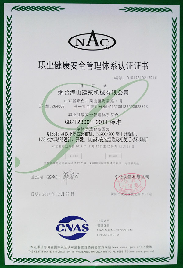 職業(yè)健康安全管理體系認(rèn)證證書